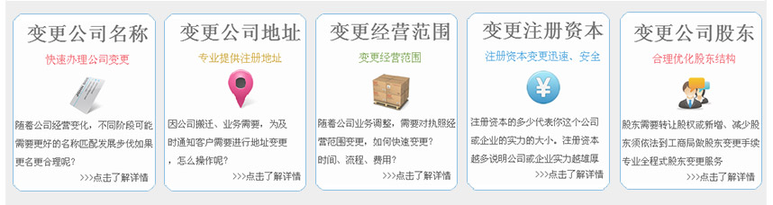 變更公司名稱 變更公司股東(股權(quán)) 變更公司法人 變更公司地址 變更公司經(jīng)營(yíng)范圍 變更公司注冊(cè)資本